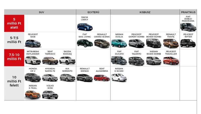 A modellek többsége a töretlen népszerűségű városi terepjárók kategóriájába tartozik: „Eladásainkat tekintve a SUV-ok a 2018-ban értékesített autóink több mint egyharmadát tették ki. Méreteinek, kialakításának köszönhetően plusz kényelmet és biztonságérzetet nyújtanak használóinak, emellett a design is igazán meggyőző érv a SUV-ok mellett” – tette hozzá az igazgató. Arról nem is beszélve, hogy a legtöbb modell hétszemélyes változatban is elérhető, mint a Honda CR-V, a Hyundai Santa Fe, a Kia Sorento, a Mitsubishi Outlander, a Nissan X-Trail, a Skoda Kodiaq, a Seat Tarraco vagy a Volvo XC90. A legkedvezőbb választás a SUV-ok közül a Peugeot 5008 lehet a nagycsaládosok számára, hiszen ez a modell már 7,2 millió forinttól elérhető.