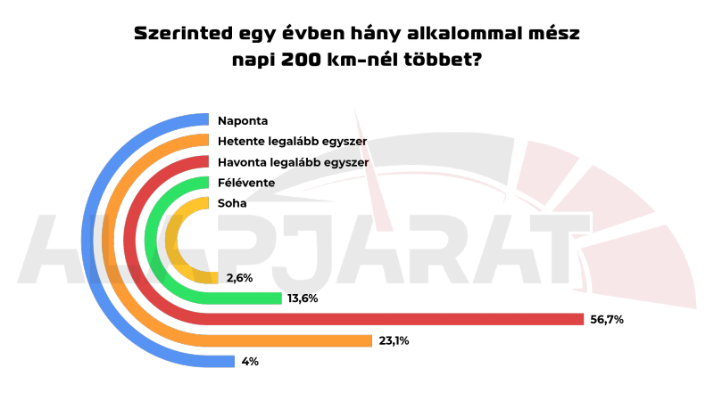 Statisztikák szerint az átlagembernek nincs szüksége napi 200 kilométeres hatótávnál többre. Ennek megfelelően az Alapjárat felmérését kitöltők 13,6%-a maximum évente kétszer megy ennél többet, 56,7 % pedig havonta legalább egyszer. 23,1% megy ennyit vagy többet hetente legalább egyszer. Csupán a megkérdezettek 4%-a megy szinte minden nap 200 km fölött és ott vannak azok is, akik szinte soha, ők teszik ki a válaszadók 2,6%-át.