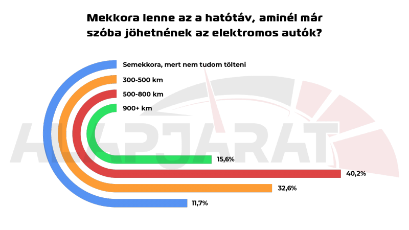 Az emberek 15,6%-a akkor gondolkodna el egy villanyautó megvásárlásán, ha dízelverő hatótávval (900+ km) rendelkeznének, 40,2% pedig akkor, ha a hagyományos belsőégésű motorral szerelt autók átlagos hatótávjával rendelkeznének. 32,6% számára elég lenne a maximum 500 kilométeres hatótáv is és 11,7% mondja, hogy neki mindegy mennyit megy el az elektromos autó, mert úgy sincs lehetősége tölteni.