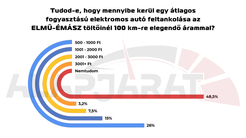 Még az ELMŰ-ÉMÁSZ töltőin is kijön ugyanez 2 020 Ft-ból (kalkulálva a töltési veszteséggel), ahol 99 Ft-ot kérnek 1 kWh áramért. Ezzel mindössze a válaszadók 7,5%-a van tisztában, 3,2% hiszi (tévesen), hogy 3 000 Ft-nál is többe kerülne a töltés. 15% gondolja, úgy, hogy 1 000 és 2 000 Ft közötti összegből kijönne a töltés. 26% tévesen 500 és 1 000 Ft közé lőtte be az árat, 48,5%-a pedig egyáltalán nincs tisztában az árakkal.