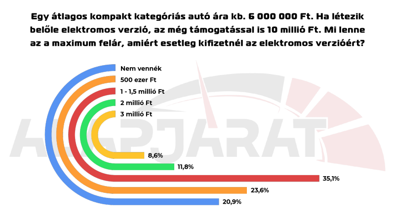Az emberek 23,6%-a csak akkor venné meg az elektromos verzióját, ha csupán 500 000 Ft-tal lenne drágább. 35,1% kifizetné az 1-1,5 milliós felárat is. 2 000 000 forint többlet kifizetésére 11,8% lenne hajlandó, 8,6% pedig akár a 3 milliót is megadná érte. Beszédes adat, hogy a válaszolók 20,9%-a egyáltalán nem venne elektromos autót, akkor se, ha egyáltalán nem lenne felára.