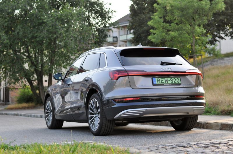 Az e-tron rugalmassága nagyon meggyőző, de a legjobb a kényelme. Széria a légrugózás, ami bámulatosan simítja ki az úthibákat, 120 km/óra felett 2,5 centivel leengedi az autót a jobb légellenállás érdekében, de off-road módban ennek a kétszeresével is meg tudja emelni a futóművet. Az e-tron az egyik legcsendesebb autó, amit valaha vezettünk, ez az elektromotoron kívül az opcióként rendelt akusztikus üvegek érdeme is. A felfüggesztése kanyargós szakaszon is úton tartja, de hiába az alacsony súlypont és a tökéletes súlyelosztás, az e-tron a nagy tömege miatt nem szerpentinekre termett. A hosszabb utakra azonban tökéletes, és már egészen messze is elindulhatunk vele. A gyárilag megadott 400 kilométeres hatótáv ugyan elérhető, de csak nagyobb odafigyeléssel, reálisan használva 330 kilométer után kellett tölteni, ami az 50 kilowattos villámtöltőnél másfél órát vehet igénybe, de az otthoni konnektorról 2,1 kilowattal másfél nap is kellhet hozzá. Az e-tront felkészítették a 150 kilowattos villámtöltésre is, amit nálunk egyelőre csak két Ionity töltőről használhat ki. A hálózat bővülésével könnyebb lesz elköteleződni az elektromos Audi mellett, mert a térkínálata és a minősége a márka többi típusához mérhető, a vezetése újszerű élmény, a felszereltsége pedig éppen olyan bőséges, mint amit egy 39 milliósra extrázott luxusautótól elvárhatunk.