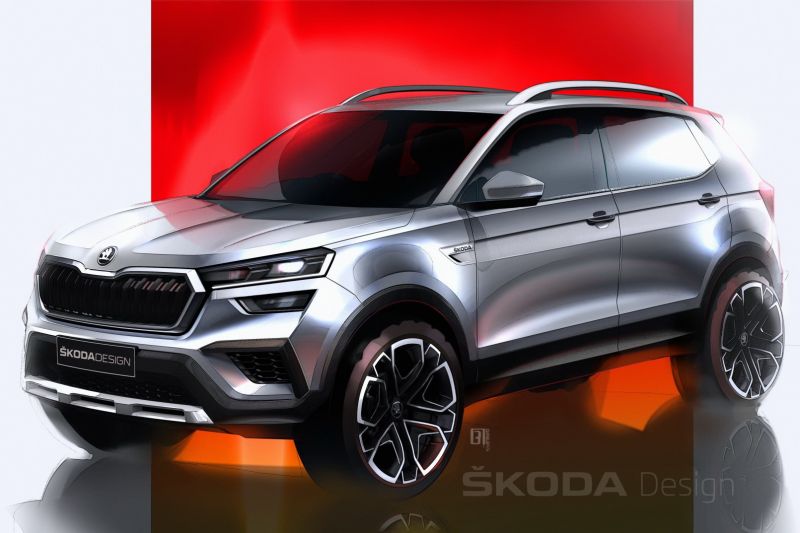 Az egyik dizájnrajzon az új Skoda KUSHAQ erőteljes kialakítású eleje látható. A modell nevének eredete az ősi indiai szanszkrit nyelvre vezethető vissza, amelynek „Kushak” szava „királyt” vagy „uralkodót” jelent. Feltűnőek az éles metszésű, kétrészes fényszórók, amelyek egészen a széles Skoda hűtőrácsig nyúlnak. Az alsó védőidommal kialakított, masszív első lökhárító a SUV-modell atletikus megjelenését hangsúlyozza.