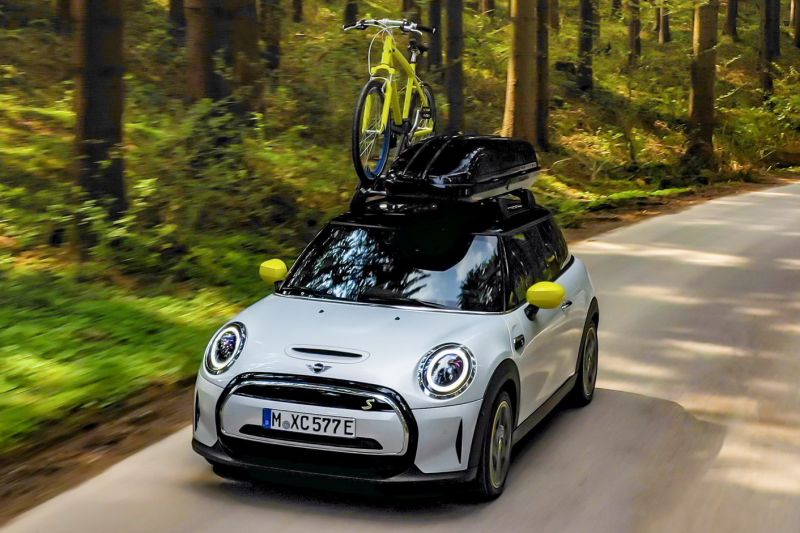 És mivel a MINI által fémjelzett kreatív helykihasználás alól a MINI Cooper SE teteje sem kivétel, a MINI tetőbox mellett még egy kerékpárszállító kiegészítőnek is marad hely. Az eredeti MINI tartozékok közül megrendelhető kiegészítő bármekkora méretű és bármilyen típusú kerékpárt képes függőleges pozícióban rögzítve biztonságosan szállítani. Utóbbit magas szilárdságú alumíniumból készült kerékvezető, zárható szorítórendszer és két rögzítőszíj garantálja. Az eredeti MINI tartozékok közül olyan szállítórendszerek is megrendelhetők, mint például a sífelszerelés-rögzítő vagy az alumíniumból készült csomagrögzítő tálca, amelyek ugyancsak kompatibilisek a tetősínekkel.