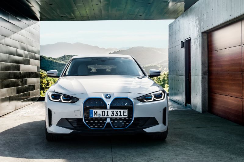 Szinte teljes egészében zárt frontrész és nagyméretű BMW hűtőrács, amelynek felülete mögött a fedélzeti intelligens vezetést támogató rendszerek érzékelői, radarszenzorjai és kamerái dolgoznak. Keskeny első fényszórók, az opcionális extrafelszereltség részeként BMW Laserlight lézerfény-technológiával. BMW i kék árnyalatú karosszéria-kiegészítő betétek. BMW i4 eDrive40 M Sport felszereltségi opciókkal és BMW i4 M50 típus-specifikus, teljesítményre optimalizált kiegészítőkkel. Az M Carbon külső felszereltségi csomag tételei és a BMW M Performance alkatrészek a modell piaci bevezetésétől kezdve elérhetőek.