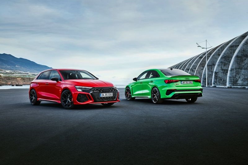 Az új Audi RS 3 modellek** az RS-specifikus Kyalami-zöld és Kemora-szürke színben is rendelhetők, s első ízben fényeztethető a Limousine teteje Briliánsfekete kontrasztárnyalatra. Az egyes külső elemek, mint például a Singleframe hűtőrács méhsejtmintázatú betétje, már alapkivitelben matt vagy magasfényű fekete bevonatot kapnak. Kívánságra az első lökhárító, a diffúzorbetét és az ablakszegélyek alumíniumszínűek az alumínium optikai csomag részeként, a még sportosabb megjelenés szolgálatában pedig az oldalsó küszöbborítások betétjei szénszálerősítésű műanyag (karbon) kivitelben is készülhetnek, akárcsak a külső visszapillantó tükrök házai, illetve a Limousine csomagtérfedelének légterelője és a Sportback tetőlégterelője.