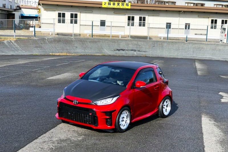 Persze a karosszérián szinte mindent lecseréltek, hogy harciassá tegyék a megjelenést, például sikerült a GR Yaris lámpáit úgy felszerelni, hogy nem látszódik, hogy utólagos átalakításról van szó. Ezen kívül kiszélesített sárvédőket, küszöbidomokat, és púpos, szénszálból készített motorháztetőt is kapott a kis zsebrakéta, és még az elöl hatalmas légbeömlővel, hátul diffúzorral rendelkező lökhárítók is teljesen úgy néznek ki, mintha a GR Yarisról származnának. Belül komoly kagylóülés, háromküllős Momo sportkormány, egyedi műszerezettség és egy telemetria-kijelző fogadja a sofőrt, aki így valódi versenyautóban érezheti magát.