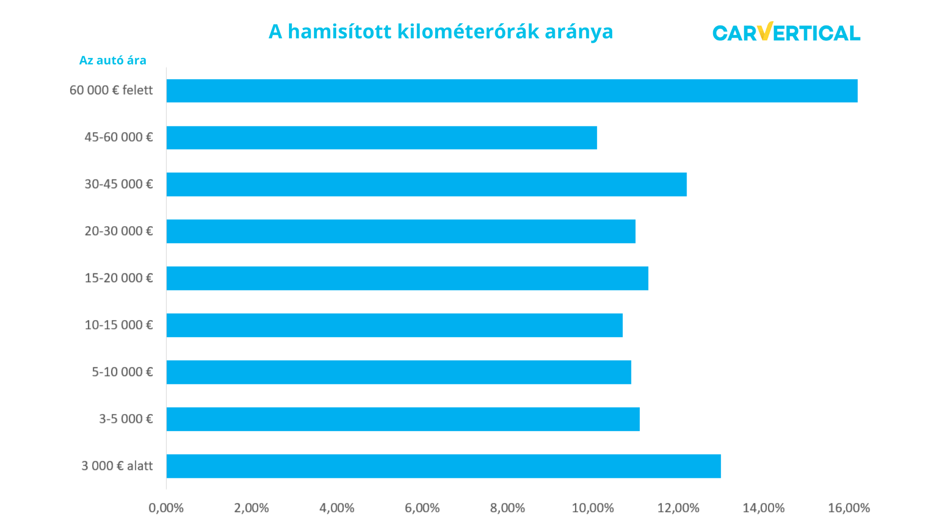 hamisított állása és az autó sérülései között. A kilométeróra-visszatekerések egyaránt jellemzőek a