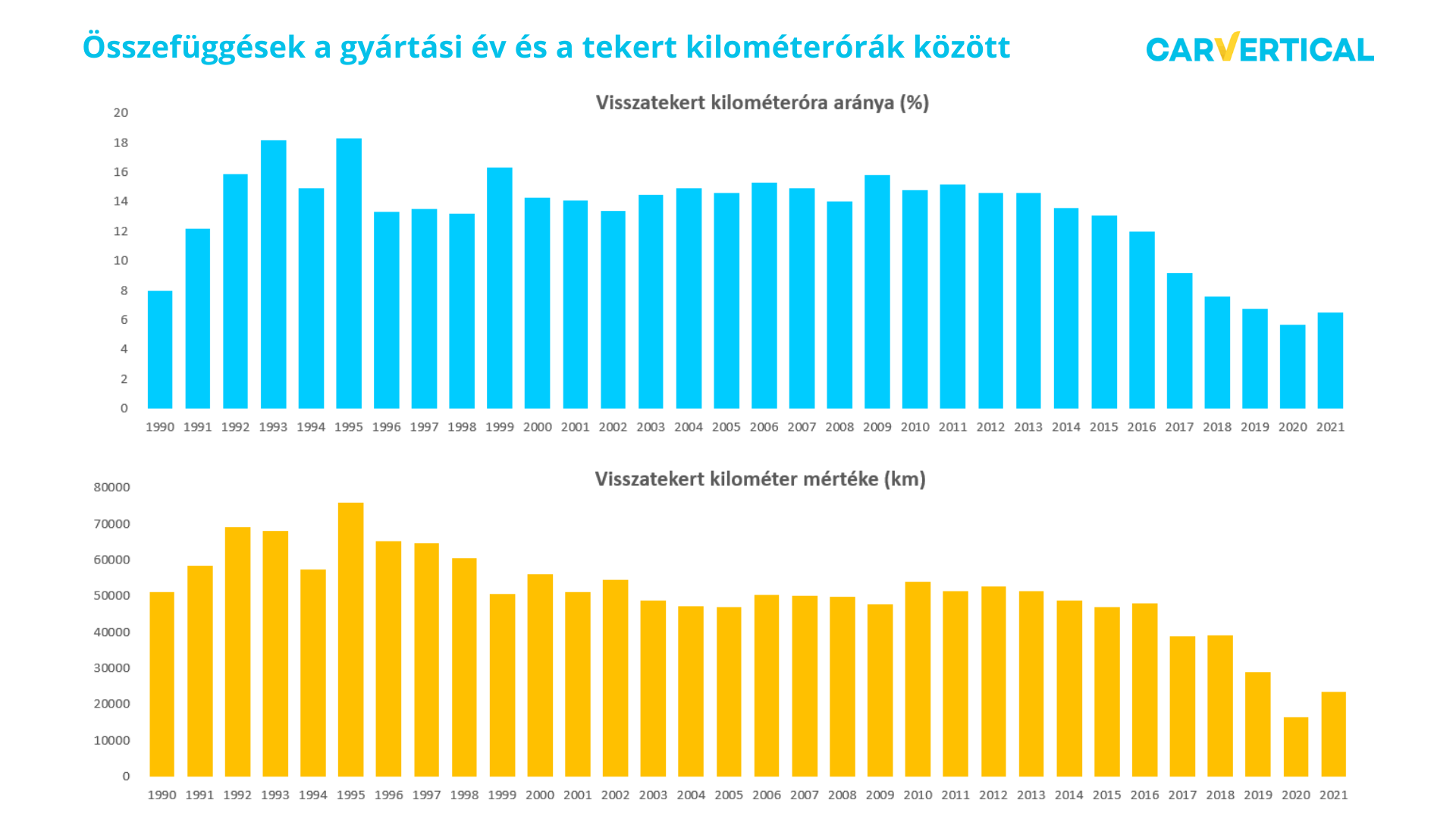 legkevesebb visszatekerés, a legtöbb kilométeróracsalás pedig az 1992-1995 között gyártott autókat